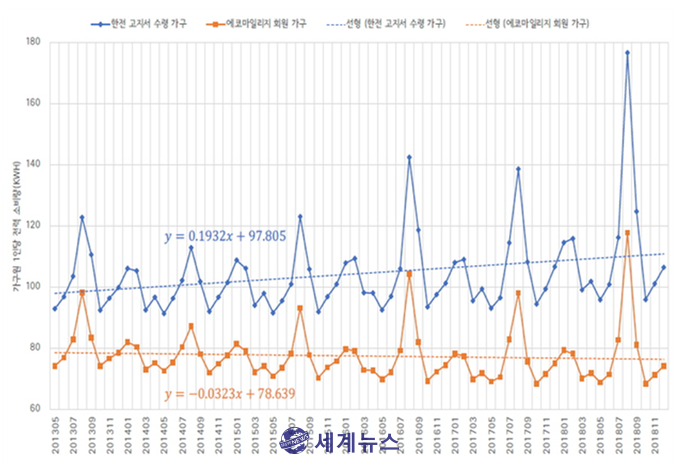 [세계뉴스] 윤소라 기자 = 서울시가 에코마일리지제 운영 내실화를 위해 ㈜국토환경연구원과 함께 설문조사 및 데이터 분석을 실시한 결과, 에코마일리지 회원이 가입하지 않은 시민보다 에너지 절약을 위해 더 많이 노력하는 것으로 나타났다. 또한 에코마일리지 회원 가구의 1인당 전력소비량은 일반 시민에 비해 감소 추세에 있음을 확인했다.