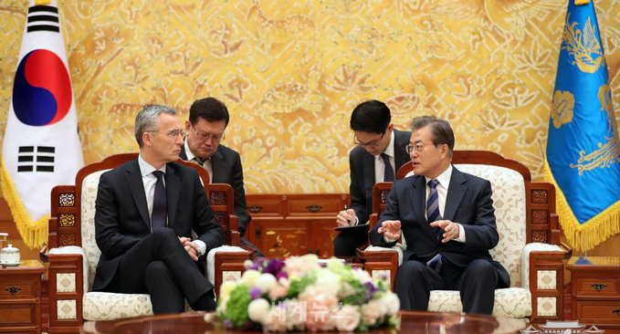 | ▲ 문재인 대통령은 2일 오후 2시 방한 중인 옌스 스톨텐베르그 북대서양조약기구(나토, NATO) 사무총장을 접견하고, 북핵 미사일 등 한반도 동북아 정세와 관련 다양한 의견을 나누었다. © 세계뉴스 |