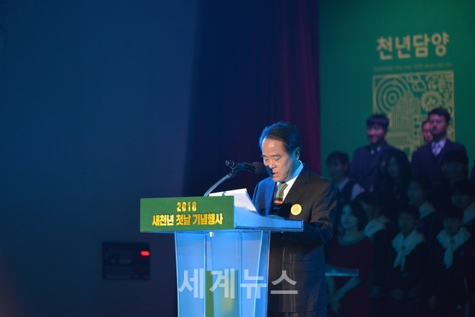 | ▲ 최형식 담양군수. 담양군은 무술년 새해 첫날 1일 오후 2시 담양종합체육관에서 군민과 1000인 합창단을 비롯한 관계기관 및 사회단체 등 2500여 명이 참석한 가운데 ‘새천년 첫날 기념행사’를 개최했다. © 세계뉴스 |