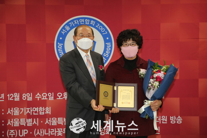 | ▲ 지난8일 오후 서울기자연합회 ‘2021 지방자치 大賞’ 시상식에서 강북구의회 국민의힘 유인애 의원(오른쪽)이 의정대상을 수상했다. (기자단 제공) |