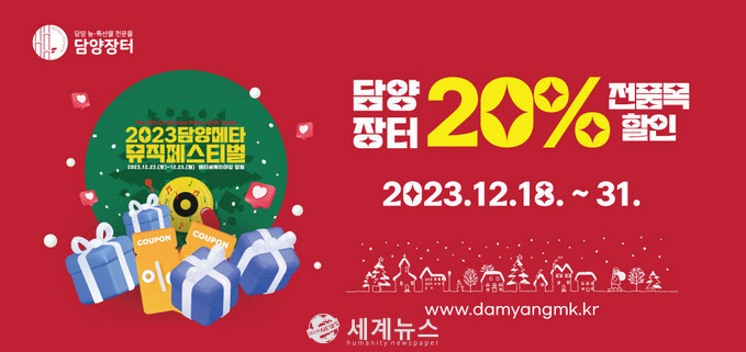 [세계뉴스 양경희 기자] 담양군(군수 이병노)은 연말을 맞이해 오는 12월 31일까지 지역 농특산물 전문 판매장 ‘담양장터’에서 전 품목 20% 특별 할인행사를 진행한다고 밝혔다.