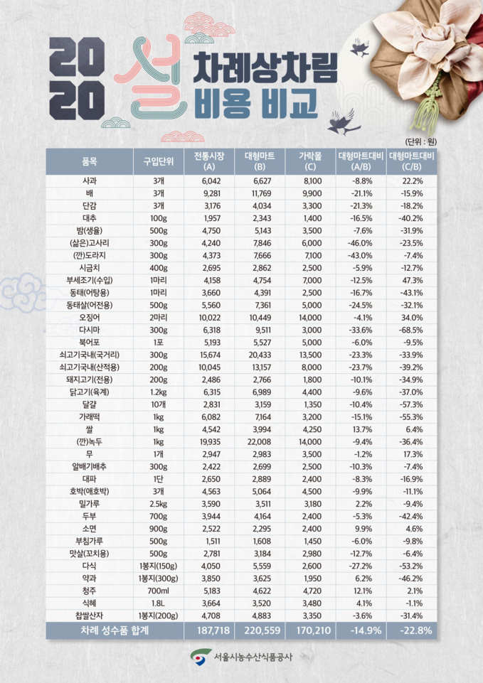[세계뉴스 조홍식 기자] 서울시농수산식품공사(사장 김경호)는 알뜰한 설 명절 준비에 도움이 되는 정보를 제공하기 위해 서울시내 25개구 전통시장, 대형마트 및 가락시장 내 가락몰 등 총 76곳을 대상으로 2020년 설 차례상차림 비용을 조사.발표했다.