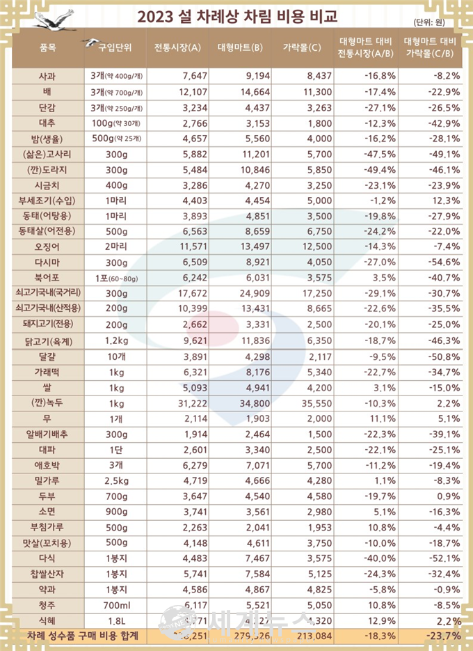 서울특별시농수산식품공사(사장 문영표)는 설 명절을 맞이하여 명절 장보기에 도움이 되는 정보를 제공하기 위해 서울시내 5개 권역생활권 7개구의 전통시장, 대형마트 및 가락시장 가락몰 등 총 22곳을 대상으로 2023년 설날 차례상 구매 비용을 조사한 결과를 발표했다.