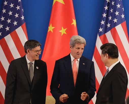 | ▲ 존 케리 미국 국무장관(왼쪽 두번째)이 6일 중국 베이징에서 개막한 제8차 미중 전략경제대화에서 시진핑 중국 국가주석(오른쪽)과 대화하고 있다. <왼쪽부터 제이컵 루 미 재무장관, 케리 장관, 시진핑 주석>. © 세계뉴스 |
