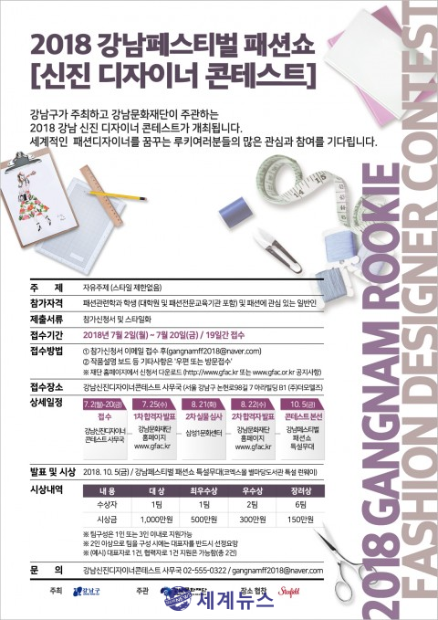[세계뉴스] 조홍식 기자 = 강남문화재단은 2018 강남페스티벌 패션쇼 ‘신진 디자이너 콘테스트’를 개최하고, 이에 앞서 행사를 빛낼 참가 작품을 7월 2일부터 20일까지 19일간 모집한다고 밝혔다.