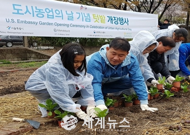 | ▲ 도시농업인의 날 기념 텃밭 개장행사에 참석한 김준형 서울시의원이 상추 모종을 함께 심고 있다. |
