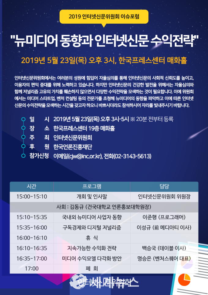 이슈포럼 참가신청은 인터넷신문위원회 사무처(02-3143-5613)로 하면 된다.