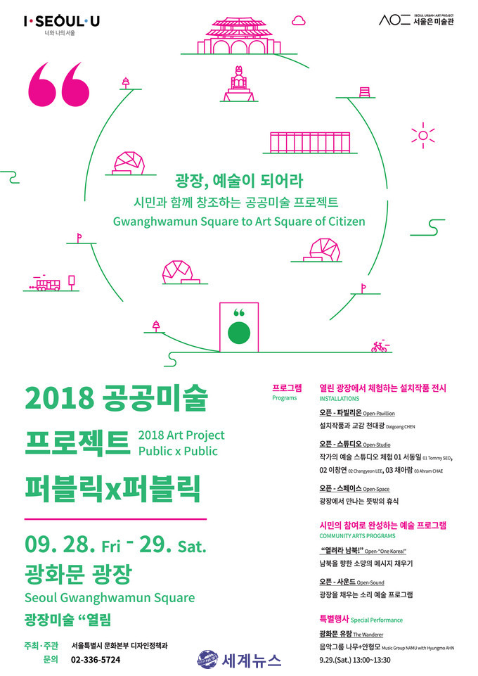 [세계뉴스] 정서영 기자 = 서울시는 28일부터 29일까지 이틀간 광화문 광장에서 공공미술 프로젝트 ‘2018 퍼블릭x퍼블릭: 광장미술 열림’’을 개최한다고 밝혔다.