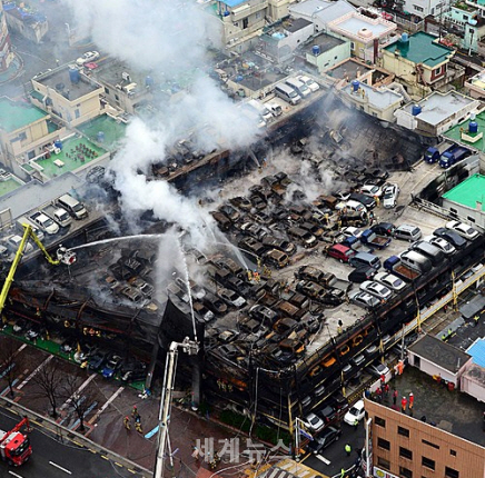 지상 3층 규모인 이 곳의 2층에서 시작된 불은 3층으로 번지면서 주차된 중고차량 570여 대가 불에 탔고, 철골구조물 일부가 거센 불길에 녹아 내렸다.