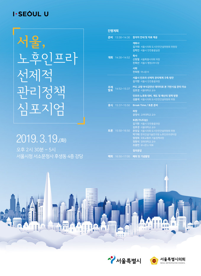 이번 심포지엄은 노후인프라에 대한 대비, 미래 도시안전 방향에 대한 논의를 위한 것으로 서울시와 서울시의회가 공동 주최했으며, 주제발표, 토론, 질의응답 순으로 진행된다.