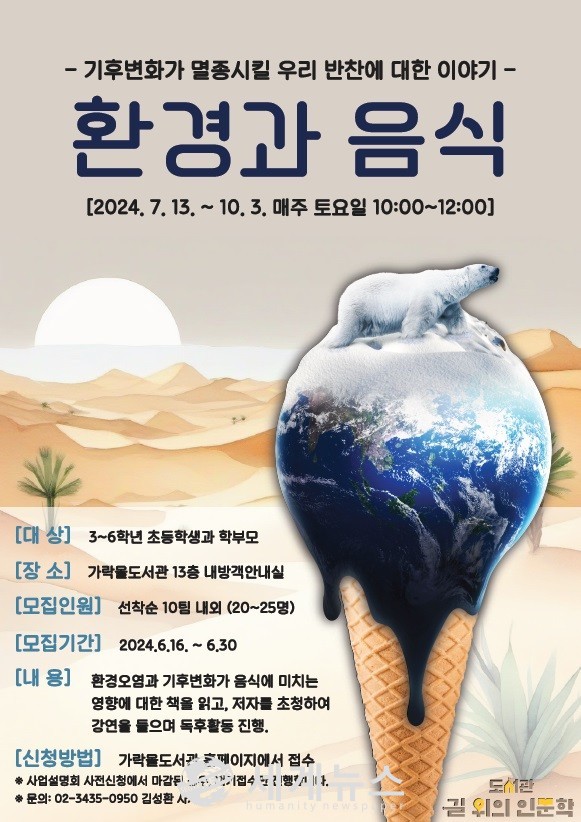 “환경과 음식” 프로그램은 갈수록 심각해지는 기후변화가 우리 식생활에 미치는 영향을 배우고 지속가능한 식문화를 위해 어떤 도움을 줄 수 있을지 생각해보는 시간으로 구성되었다. 식문화 특화 도서관의 전문성을 살려 멸종 위기에 놓인 식재료로 음식을 직접 만들고 먹어보는 독후활동도 진행할 예정이다.