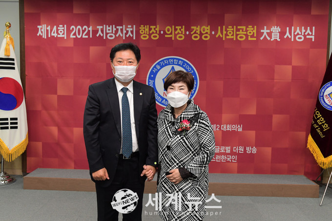 | ▲ 서울특별시의회 기획경제위원회 채인묵(왼쪽) 위원장이 8일 서울특별시의회 의원회관에서 개최된 ‘제14회 2021년 지방자치 행정·의정·경영 사회공헌 대상’ 시상식에서 의정대상을 수상했다. 더불어민주당 전혜숙 최고위원이 축하와 기념촬영을 하고 있다. (기자단 제공) |