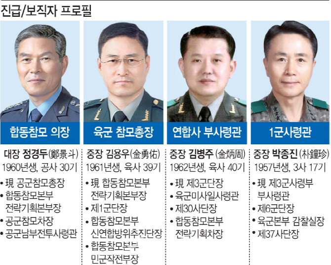 출신 파괴도 눈에 띄는 대목이다. 서부전선과 수도권 방어를 책임지는 육군 3군사령관에는 김운용(육사 40기) 2군단장이 임명됐지만 동부전선을 담당하는 1군사령관과 후방 지역을 방어하는 2작전사령관에는 각각 비육사 출신인 박종진(3사 17기) 3군사령부 부사령관과 박한기(학군 21기) 8군단장을 임명했다.