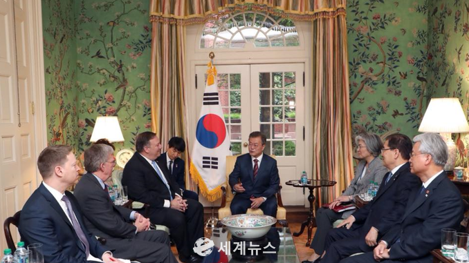 [세계뉴스] 탁병훈 기자 = 미국을 방문중인 문재인 대통령은 22일 오전(미국 현지시간) 워싱턴 영빈관에서 마이크 폼페이오 국무장관, 존 볼튼 백악관 국가안보보좌관을 접견하고 내달 12일로 예정된 역사적 미북정상회담의 성공을 위해 최선을 다해달라고 당부했다.