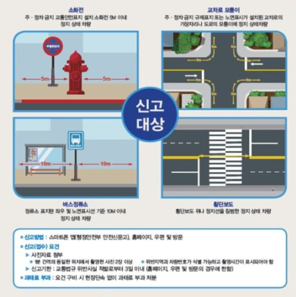 행정안전부가 밝힌 4대 절대 불법 주·정차 지역이란 △소화전 5m 이내 △교차로 모퉁이 5m 이내 △버스 정류소 10m 이내 △횡단보도를 말한다.