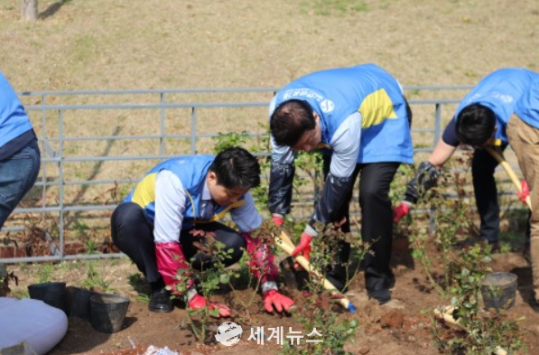 | ▲ 17일 신한금융그룹 임직원들이 봉사활동에 나서 장미를 심고 있다. |