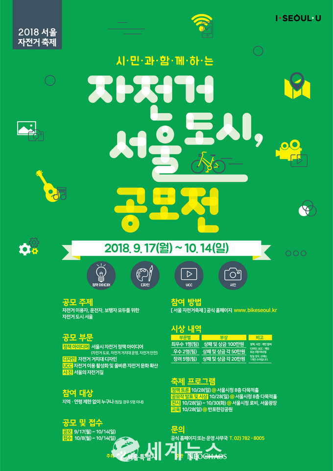 [세계뉴스] 윤소라 기자 = 서울시가 시민과 함께 미래형 서울 자전거 정책 아이디어를 발굴하고 정책에 반영하기 위해 ‘2018서울자전거축제’ 일환으로 ‘자전거 도시, 서울 공모전’을 개최한다.