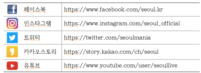 | ▲ 서울시 대표 소셜미디어(SNS) 주소. |