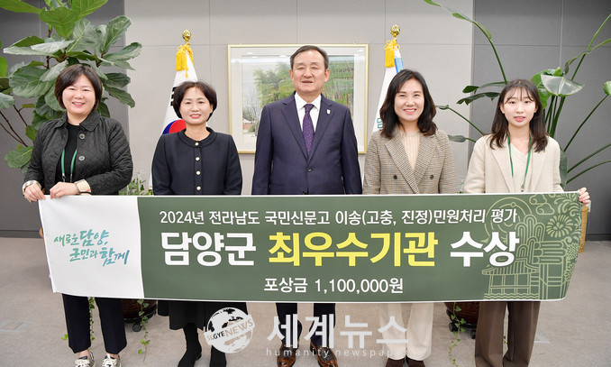 [세계뉴스 양경희 기자] 담양군(군수 이병노)은 전라남도가 주관하는 2024년도 국민신문고 이송 민원 처리 실태점검 결과 지난해 우수상에 이어 최우수상과 포상금을 수상했다고 20일 밝혔다.