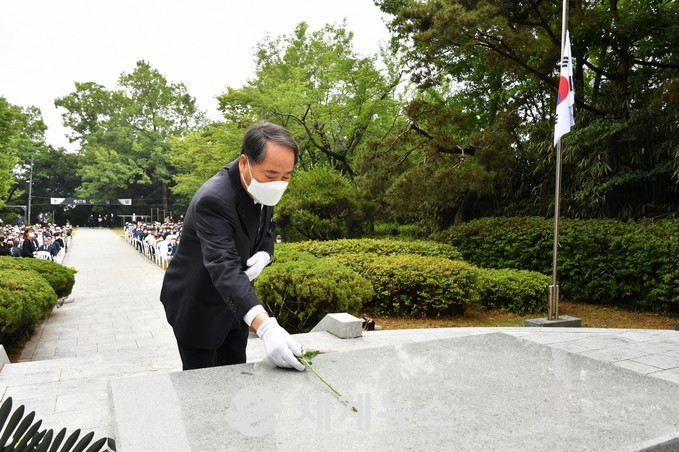 | ▲ 6일 관어공원 현충탑 광장에서 열린 ‘제67회 현충일 추념 행사'에 최형식 담양군수가 헌화하고 있다. |