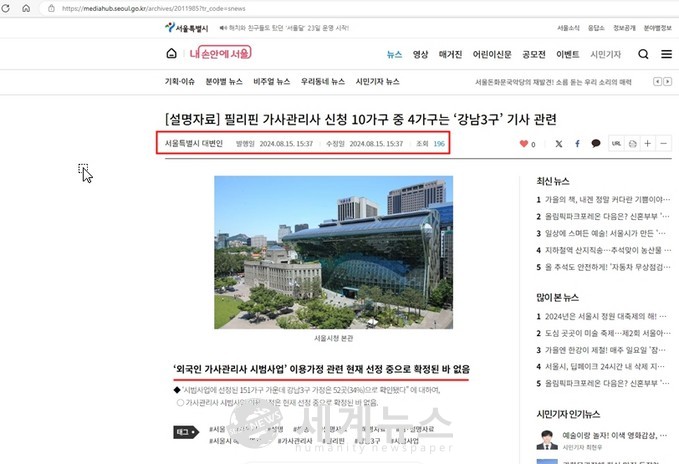 그러면서 김 부의장은 필리핀 가사관리사들의 불분명한 업무 범위와 함께 시범사업 선정가정이 강남 3구에 집중(전체 157 가정 중 강남구가 가장 많은 22가정 그다음으로 서초구 16가정, 송파구 15가정)되어 진행되고 있음을 함께 지적했다.