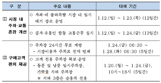 특별대책 기간은 12일부터 24일(13일간)까지 시장 내 주차·교통 혼잡 해소와 출하차량 일시 집중을 방지하기 위해 시장 내 채소2동 건립부지(구 청과직판 부지 내, 약 8,300㎡ 규모)에 사과·배 출하차량 의무 대기 장소를 운영하고, 공사와 유통인 단체 합동으로 특별 교통근무(일 최대 약 177명 투입)를 실시한다.