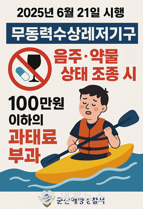 [세계뉴스 = 윤준필 기자] 술을 마시고 무동력 수상레저기구를 이용할 경우 100만원 이하의 과태료가 부과된다. 군산해양경찰서는 개정된 수상레저안전법이 오는 6월 21일 시행을 앞두고 변경·확대된 내용을 알리기 위한 홍보를 강화하고 있다.