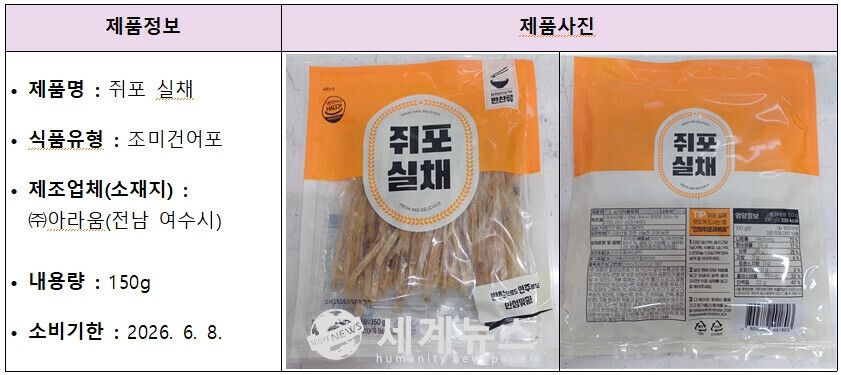 [세계뉴스 = 전승원 기자] 식품의약품안전처는 전남 여수시에 위치한 식품제조·가공업체 '(주)아라움'에서 제조·판매한 '쥐포 실채' 제품에서 식중독균인 황색포도상구균이 검출되어 해당 제품의 판매를 중단하고 회수 조치한다고 밝혔다.