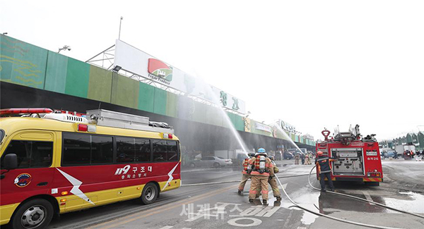 | ▲ 서울시농수산식품공사는 17일 가락시장 하반기 소방종합훈련을 공사와 송파소방서, 유통인 합동으로 실시했다. © 세계뉴스 |