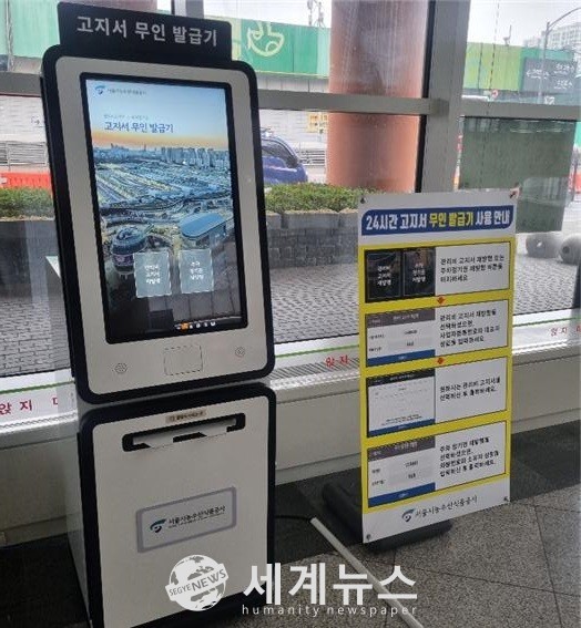 [세계뉴스 차성민 기자] 유통인‧임대입주자 고객 편의를 위해, 분실‧훼손 등의 사유로 관리비 ‧주차료 고지서를 편리한 시간에 재발급 받을 수 있는 ‘24시간 고지서 무인발급시스템’이 오는 15일 오전 10시부터 전격 시행된다.