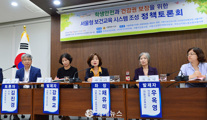 이날 토론회는 김생환 서울시의회 부의장, 서윤기 운영위원장, 장인홍 교육위원회 위원장 등 20여명의 서울시의원과 강류교 서울시보건교사회 회장, 우옥영 (사)보건교육포럼 이사장, 서울시교육청 관계자, 보건교사, 학부모 등 100여명이 참석했다. 토론회에서는 채유미 의원이 좌장을 맡아 사회를 진행했다.발제에 나선 강류교 회장은 “서울시 보건교육을 위해 과대학교 보건지원강사 배치확대와 교육청의 보건교육 담당 장학관 및 장학사 배치로 전문가 체계를 구축해야 한다”고 발표했다.