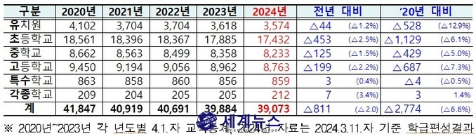 [세계뉴스 탁병훈 기자] 서울특별시교육청(교육감 조희연)은 2024학년도 유치원, 초등학교, 중학교, 고등학교, 특수학교, 각종학교의 학급편성 결과를 발표했다.