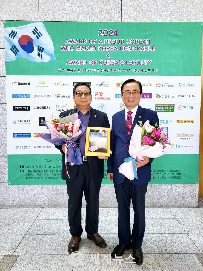 | ▲ 지난 26일 김형재(오른쪽) 서울시의원이 백범 김구기념관(서울 용산구) 컨벤션 홀에서 열린 ‘2024년 한국을 빛낸 자랑스러운 한국인 대상·대한민국 충효 대상’ 시상식에서 ‘국가통일안보 공로대상’을 수상했다. |