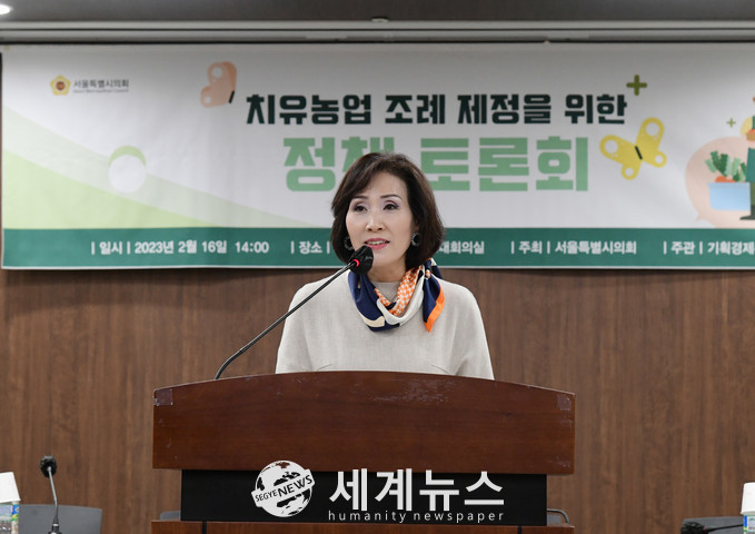 [세계뉴스 윤소라 기자] 서울특별시의회 이숙자 기획경제위원장(국민의힘·서초2)은 ‘치유농업 조례 제정을 위한 정책토론회’를 지난 16일 개최하고 조례 제정의 필요성과 완성도 높은 입법 방안에 대해 논의했다.