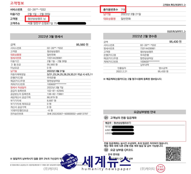 | ▲ ‘서울창업카페’ 수탁사인 ‘청년상상캠프’ 2022년 3월 통신비 명세서상 확인된 7개 회선(인터넷1, 전화6) |