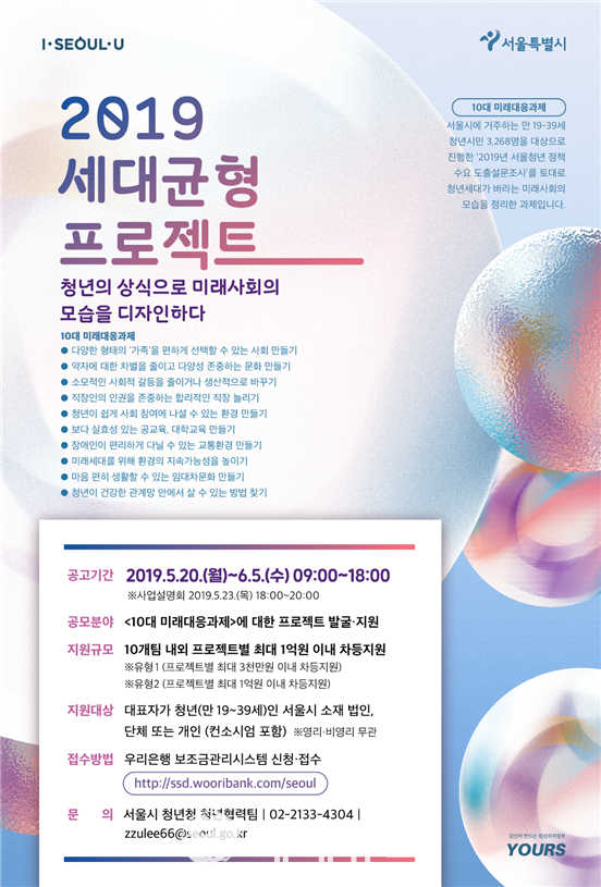 | ▲ 서울시 2019년 세대균형 프로젝트 ‘청년의 상식으로 미래사회를 디자인하다’ 참여자 모집. |