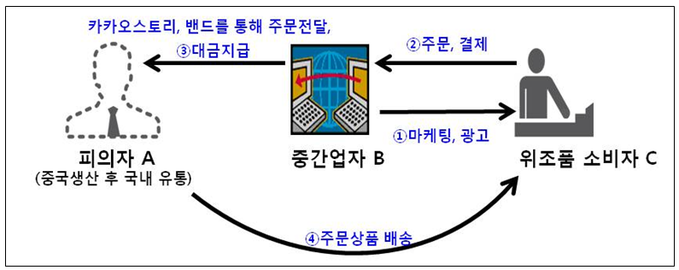 소비자 C가 중간업자 B가 운영하는 인터넷쇼핑몰에 올라온 위조품 사진을 보고 B에게 주문.결제하면, B는 A에게 대금을 지불하고 카카오스토리, 밴드를 통해 그 주문내용을 전달하면, 피의자인 A는 B가 알려준 주문내용대로 C의 주소로 주문 상품을 배송하는 시스템이다.