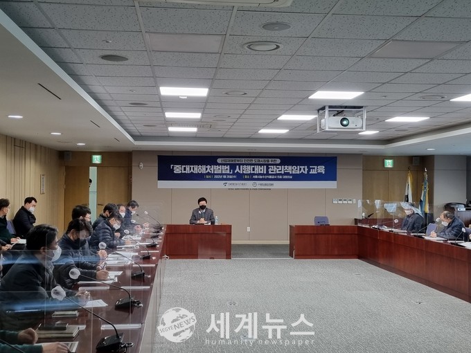 [세계뉴스 차성민 기자] 서울시농수산식품공사(사장 문영표)는 지난 26일 사장(경영책임자) 및 본부장 등 관리책임자를 대상으로 중대재해처벌법 교육을 실시했다.
