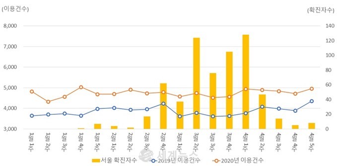 또 다른 교통수단인 나눔카 역시 따릉이와 유사하게 코로나19 발생기간중 특별히 감소된 경향이 나타나지 않았다. ’13년 서비스 개시 이후 지속적으로 실적이 증가되고 있던 나눔카는 코로나 19 감염이 절정에 달했던 3월1주~4월1주에도 전년 동월 대비 125~131%까지 이용자수가 증가하였다. 역시 20~30대가 전체 가입자수의 85%를 차지하는 만큼 나눔카는 자가차량 미보유 통행자에게 있어 대중교통의 선택대안으로 인식된 것으로 예상된다.