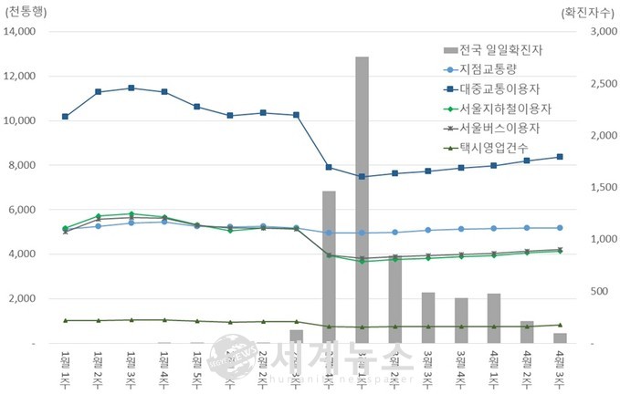 서울기술연구원(원장 고인석)은 올해 1~4월 서울 시내교통 통행 변화추이를 분석한 ‘코로나19로 인한 통행 변화, 그리고 포스트코로나에 대비한 서울 교통정책방향’ 연구 결과를 지난24일 발표했다.