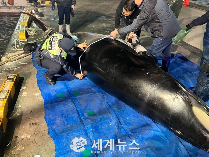 [세계뉴스 윤준필 기자] 보령해양경찰서는 23일 오후2시경 부안군 상왕등도 서방 18해리(약 33km) 해상에서 조업 중이던 어선 A호(9.77톤, 개량안강망)의 선장이 그물에 걸린 밍크고래의 사체를 발견해 장항신항에 입항하여 보령해경 장항파출소에 신고했다고 밝혔다.