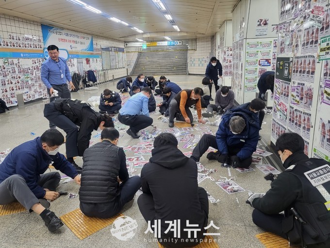 [세계뉴스 차성민 기자] 서울교통공사(이하 ‘공사’)가 27일 오전 10시 30분부터 시민 편의와 안전 확보를 위해 전국장애인차별철폐연대(이하 ‘전장연’)가 4호선 삼각지역에 무단으로 부착한 불법 부착물을 제거하는 청소에 나선다. 또한 공사는 스티커를 부착하는 행위로 청소 노동자들의 고통이 막심하다며, 스티커를 부착하지 말 것을 요청했다.