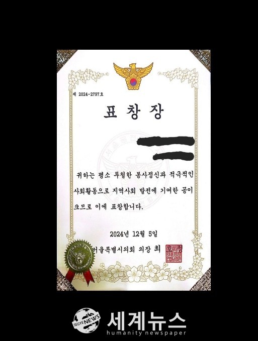 [세계뉴스 차성민 기자] 서울시의회 의장 명의를 도용한 위조 표창장이 발견돼 경찰이 수사에 착수했다. 서울시의회에 따르면, 최근 금천구 시흥4동 일대에서 최호정 서울시의회 의장 명의가 도용된 표창장이 발견됐다.