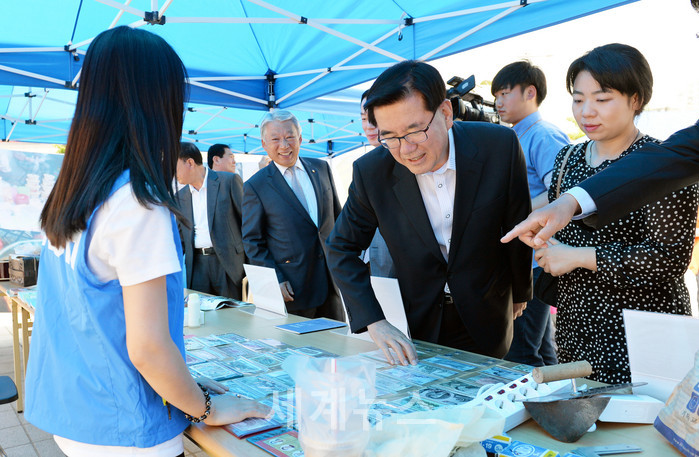 | ▲ 29일 유덕열 동대문구청장이 청량리역 광장에서 열린 북한 장마당 재연행사에서 북한 화폐를 살펴보고 있다. © 세계뉴스 |