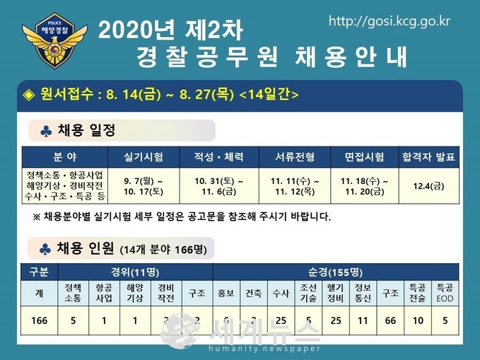 응시원서는 이달 27일까지 해양경찰 채용 누리집(http://gosi.kcg.go.kr)에서 접수가 가능하다. 분야별 최종합격자는 시험전형을 거쳐 12월 초에 발표될 예정이다.