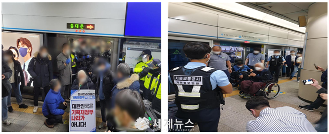 [세계뉴스 윤소라 기자] 서울교통공사가 전국장애인차별철폐연대(이하 전장연)의 지하철 열차 운행 방해 불법시위와 관련, 이로 인한 시민 불편을 최대한 줄이려는 노력을 다하는 것과 동시에 전장연 측에는 추가 시위 자제를 호소하는 입장을 밝혔다.
