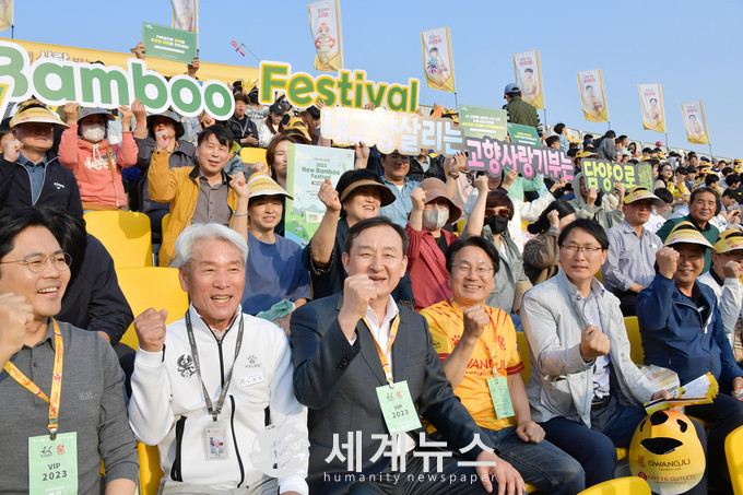 | ▲ 지난 1일 이병노 담양군수와 강기정(노란T셔츠) 광주광역시장이 광주 월드컵경기장에서 열린 광주FC 홈 경기장을 찾아 응원하고 있다. |