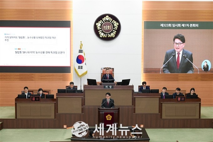 [세계뉴스 정서영 기자] 서울시의회 홍국표 의원(국민의힘·도봉2)은 19일 제323회 임시회 제1차 본회의에서 5분 자유발언을 통해 가락시장 도매법인의 독과점 문제를 지적하고 제도개선 필요성을 강조했다.