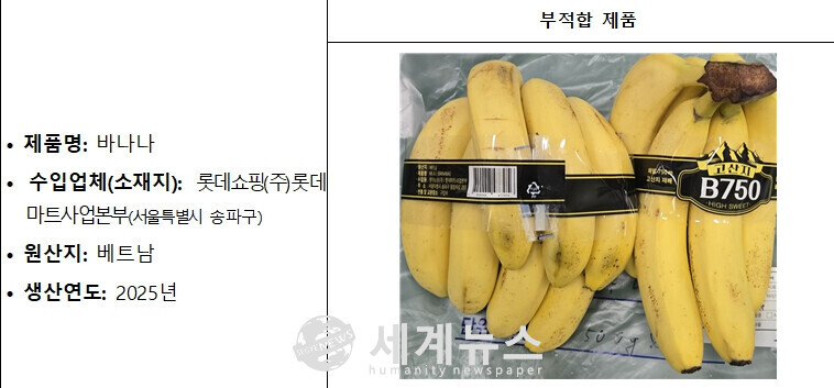 [세계뉴스 = 차성민 기자] 식품의약품안전처는 롯데쇼핑(주) 롯데마트사업본부가 수입한 베트남산 바나나에서 잔류농약 클로티아니딘 및 티아메톡삼이 기준치를 초과 검출됨에 따라 해당 제품의 판매를 중단하고 회수 조치한다고 발표했다.