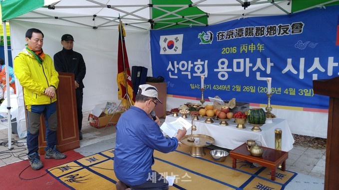 [서울=세계뉴스] 정서영 기자 = 재경담양군향우회(회장 이은성), 산악회(9대회장 이정현)는 3일 낮 12시 서울 용마산에서 병신년(丙申年) 한 해 회원들의 무사산행을 기원하는 시산제(始山祭)를 올렸다.